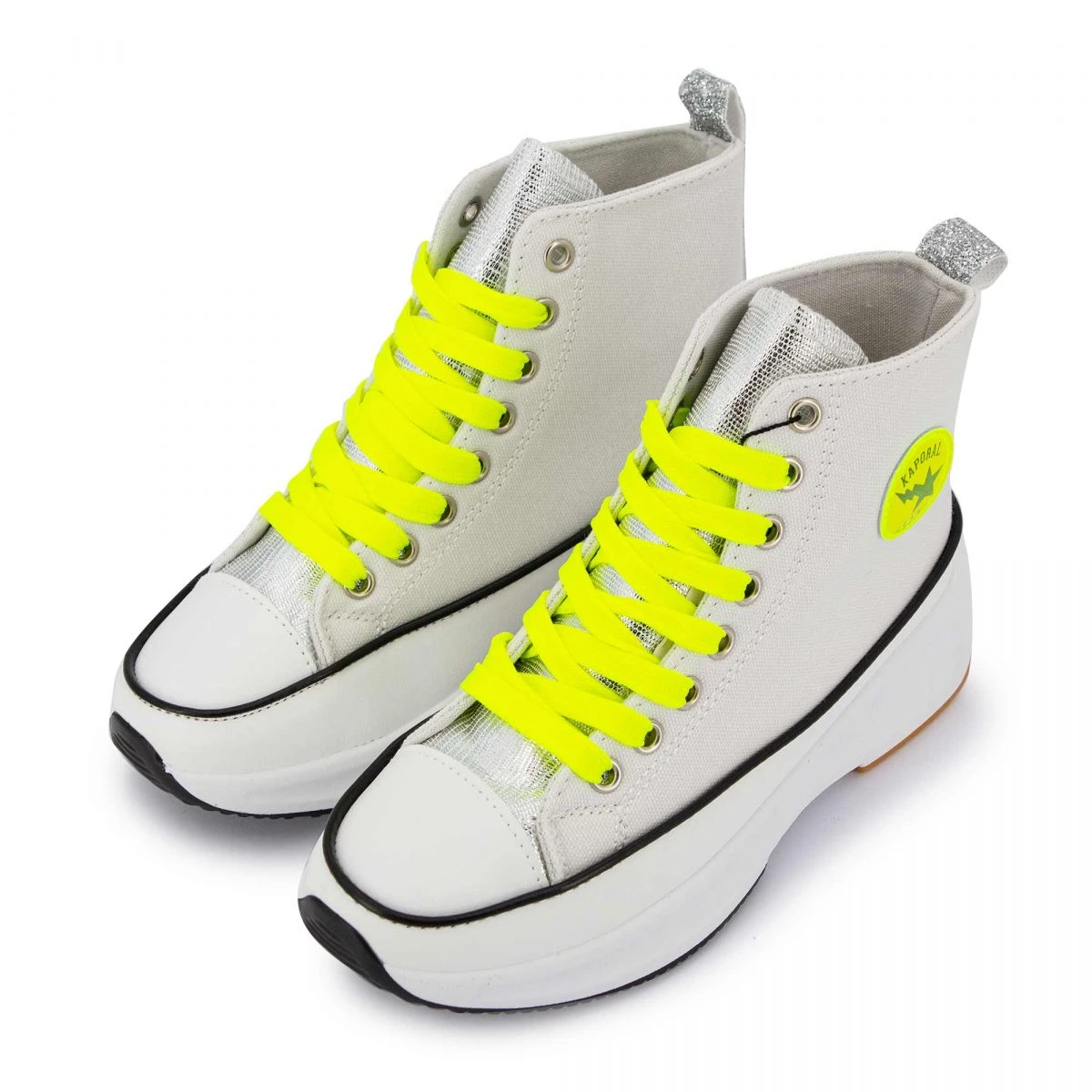 Dégriffstock vous propose cette paire de baskets montantes semelle plateforme argentées pour femme de la marque KAPORAL à prix dégriffé.