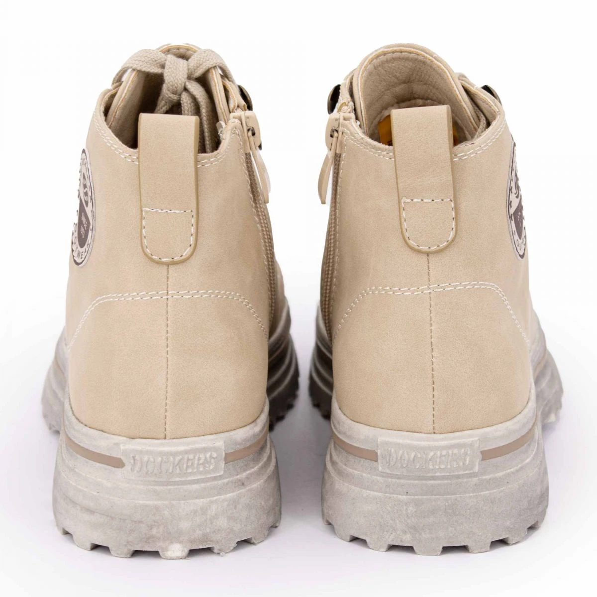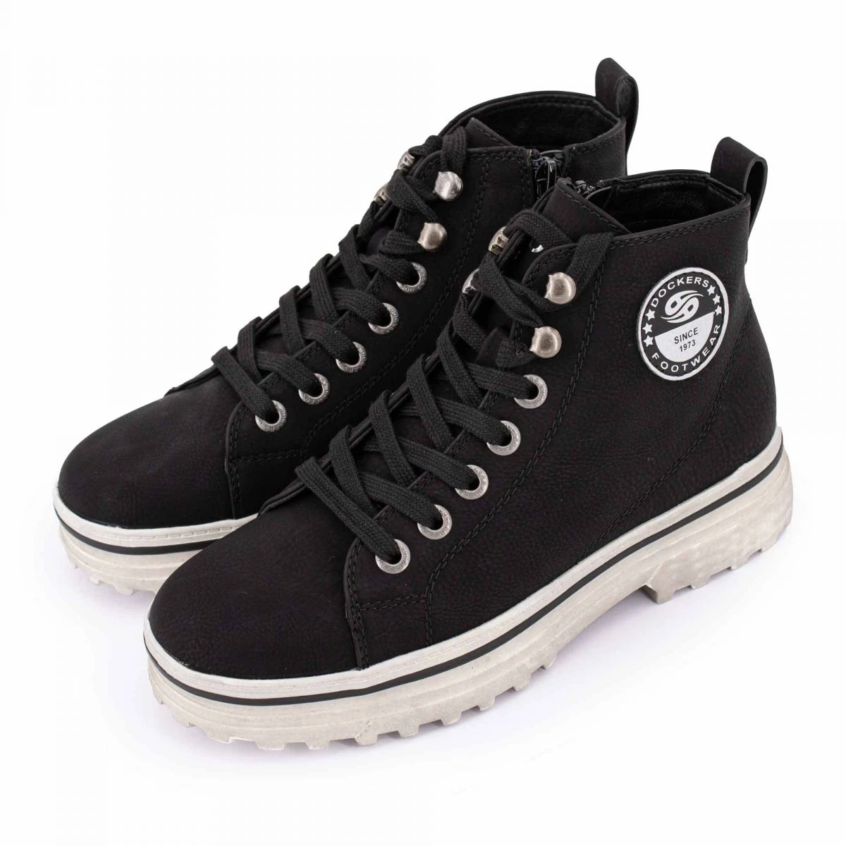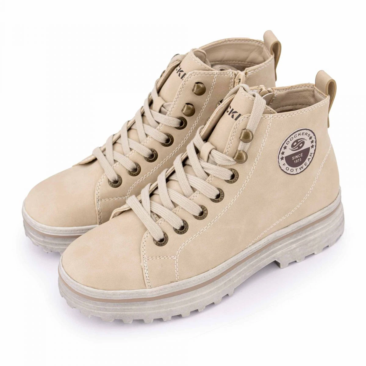 Dégriffstock vous propose cette paire de baskets montantes suédé zippées à lacets semelles crantées épaisses pour femme de la marque DOCKERS BY GERLI à prix dégriffé.
