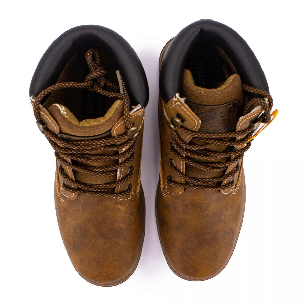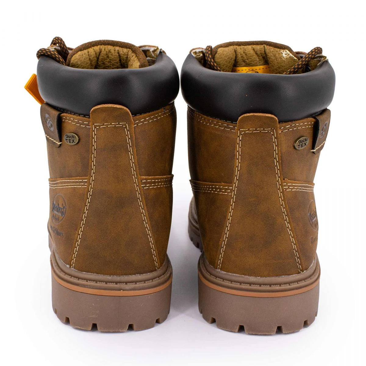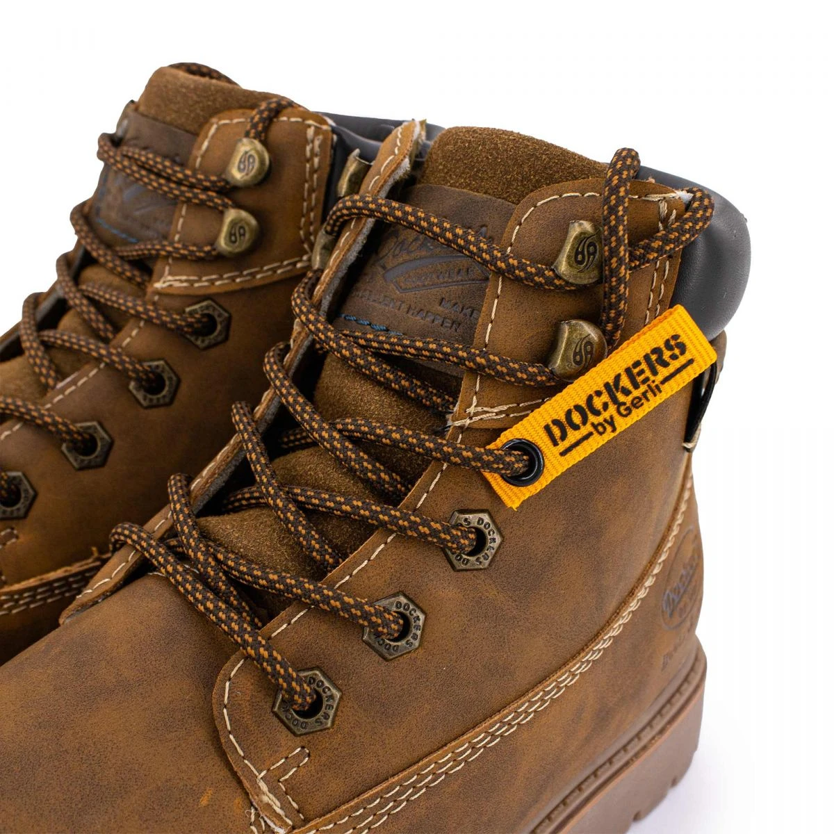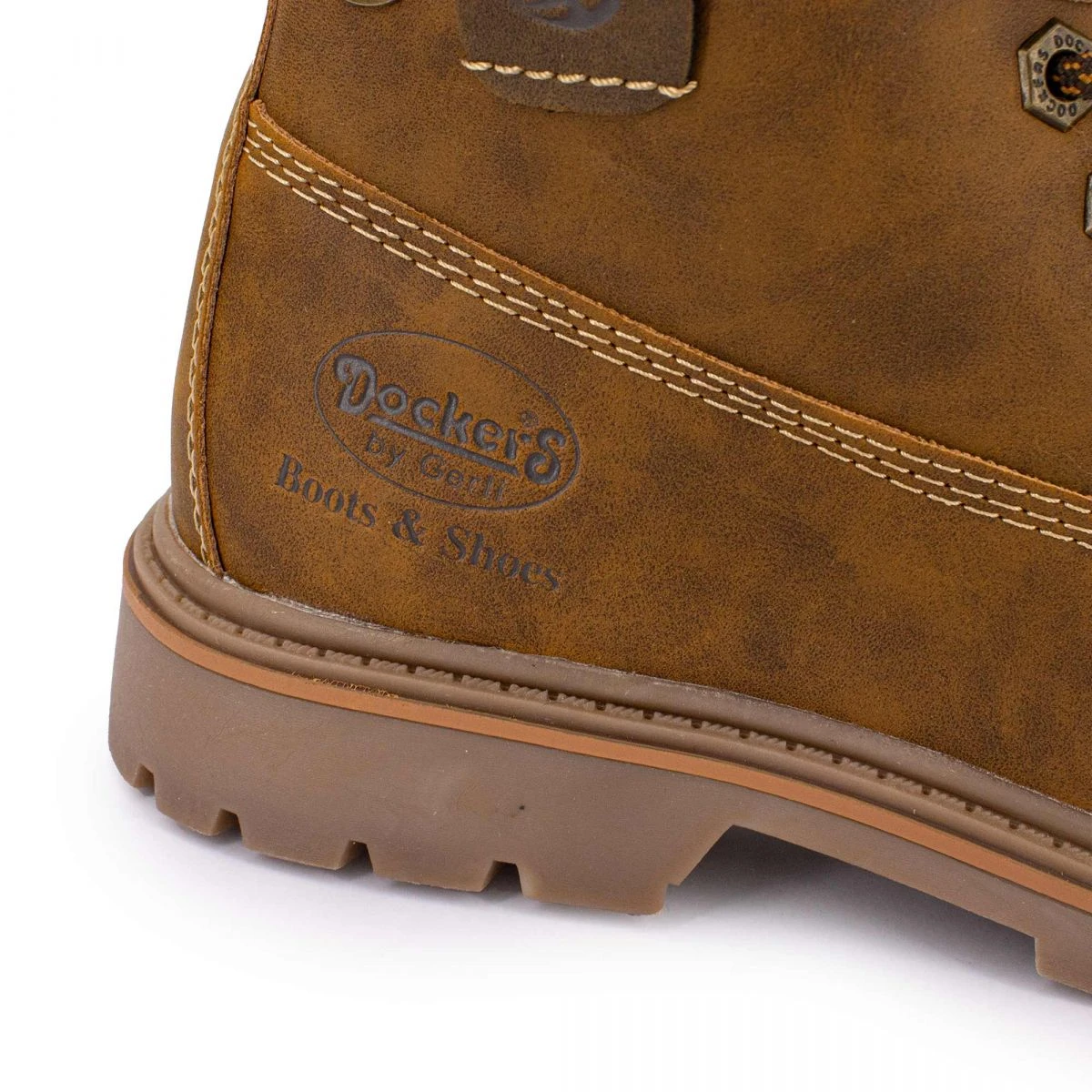 Dégriffstock vous propose cette paire de Bottines à lacets effet daim avec logo incrusté cognac pour homme de la marque DOCKERS BY GERLI à prix dégriffé.